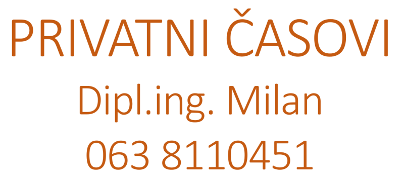 Časovi matematike,fizike,hemije,osnove elektrotehnike,mehanikI,izrada grafičkih radova,seminarskih radova,prekucavanje teksta. Od osnovne škole do fakulteta. Priprema za popravni,prijemni,završni,kontrolni. 20 godina iskustva. Dipl.ing. Milan. Mobilni tel. /viber , whatsapp : 063 8110 451