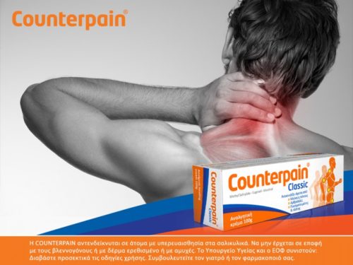 Deluje posle prvog mazanja , Counterpain Classic PharmaSwiss, ima široku primenu kod profesionalnih sportista rešava mnogo brze problem sportskih povreda . Counterpain Classic 100gr je krema koja ublažava bolove u mišićima zglobovima i reumatske tegobe kao i povrede nastale pri sportskim aktivnostima . Grčka krema perfektna za kičmene i reumatske probleme. Counterpain Classic kremu koriste profesionalni sportisti . . . a pre svega fudbaleri. Deluje odlično za bolove u mišićima, bolove u zglobovima, bolove u leđima, umirujući artritički bol. Counterpain – bezbolni krem proizvodi napravljeni od strane lokalnih analgetika iz grupe zajedničkog, mišića i skeletnih poremećaja. Mišićni bol, lumbago, išijasija, reumatizam, bol u leđima i struku, artritis. Aktivni sastojci su metil salicilat 10,2%, eugenol 1,36% i mentol 5,44% . . . Deluje umirujuće i efekat koji izaziva bolju cirkulaciju krvi, čime nestaje bol u leđima, struku, mišićima i zglobovima. Utrljava se dva do tri puta dnevno na bolno mesto , koža veoma brzo upije i ne ostaju tragovi na odeći.