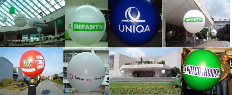Imamo lager lopti precnika 1,5m jednobojnih. Lopte su u beloj, crvenoj, teget, zelenoj i zutoj boji.Ovakve lopte napunjene vazduhom i okacene da vise su kvalitetna i relativno jeftina, a izuzetno efektivna reklama. Na lageru imamo i cepeline i lopte vecih dimenzija prvenstveno namenjene za punjenje helijumom. Ovakvi objekti sa ugradjenim unutrasnjim osvetljenjem su reklama koju ceo grad vidi za dve dana. Posedujemo opremu za sve vidove ispucavanja konfeta ili posipanje konfetama, kao i za otvorene prostore – stadione i za velike i male zatvorene prostore.Bavimo se prodajom ove opreme.Organizujemo kurseve dekoracije balonima i kurseve stampe na balonima. Prodajemo svu potrebnu opremu za dekoraciju balonima i štampu na balonima. Tel.:+381 63 516 404. E-mail:info@baloniprint.co.rs Link na kome možete da pogledate fotografije i filmove sa cepelinima, loptama, loptama za plažu, jastučićima, dušecima I navijačkim udaraljkama: https://drive.google.com/drive/u/0/folders/0B7YGY_2pMgHzfnZmNkZkaFo3TG5taTBUMzNUbFFlVldkb0ZWRXdDODNEVm9ndGlTY2VjMmc?resourcekey=0-8yMe7hCcjTS_3l_KaC9W1w
