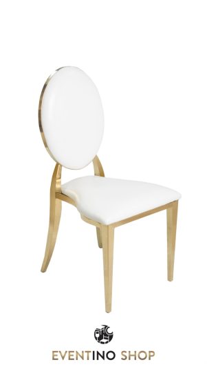Medaljon ekskluzivna stolica za svečane sale. Stolica je belog tapaciranog sedalnog dela i naslona, okvir stolice je zlatne boje, izrađen od nerđajućeg čelika. Takođe, okvir može biti srebrne boje, crne. .. dok boja eko kože sedalnog dela i naslona ide po želji: bela, crna, teget, bordo, zelena. .. Okvir stolice može biti izrađen od čelika ili od aluminijuma, a tapacirung od kvalitetne eko kože. Medaljon stolice po najpovoljnijim cenama. Dostava kroz 24h. Kontakt telefon: +38169/160-2428 Beograd