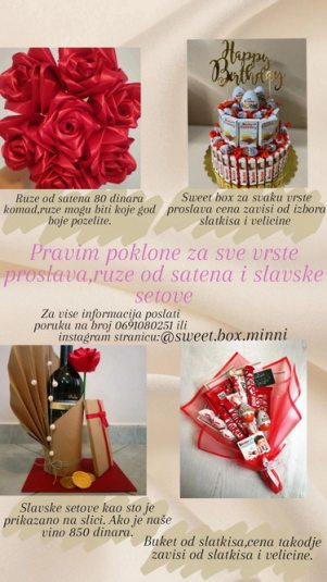 Pravim poklone za sve vrste proslava, ruze od satena u bilo kojoj boji i slavske setove. Pod poklone spadaju buketi od slatkisa, kutije koje su napravljene od slatkis po Vasem izboru. Slavski setovi kao sto je prikazano na slici uz Vas odabir vina. 0691080251